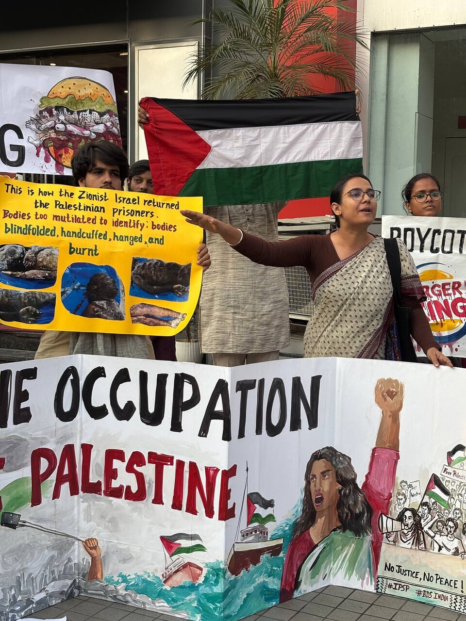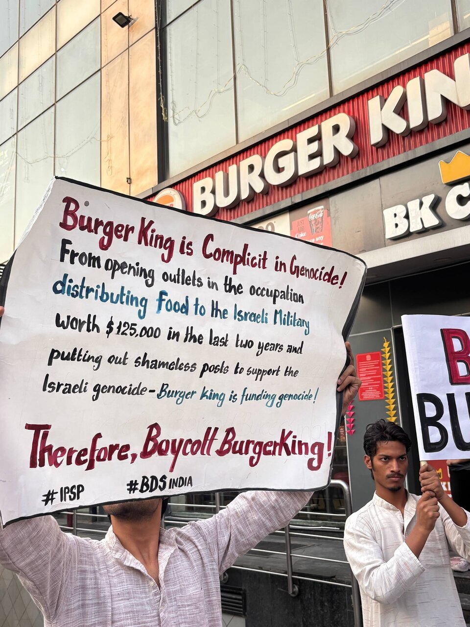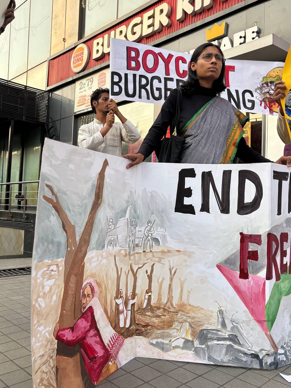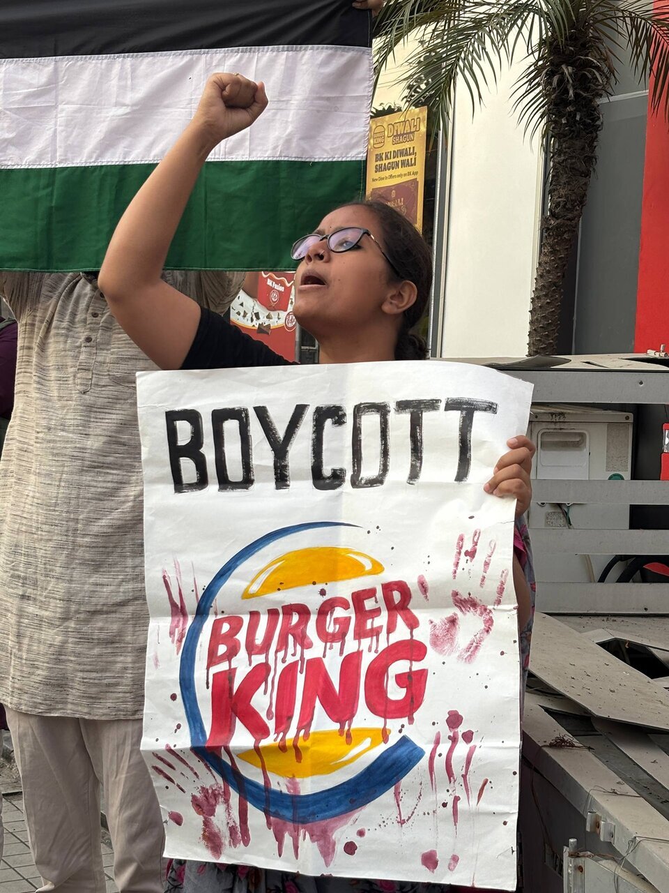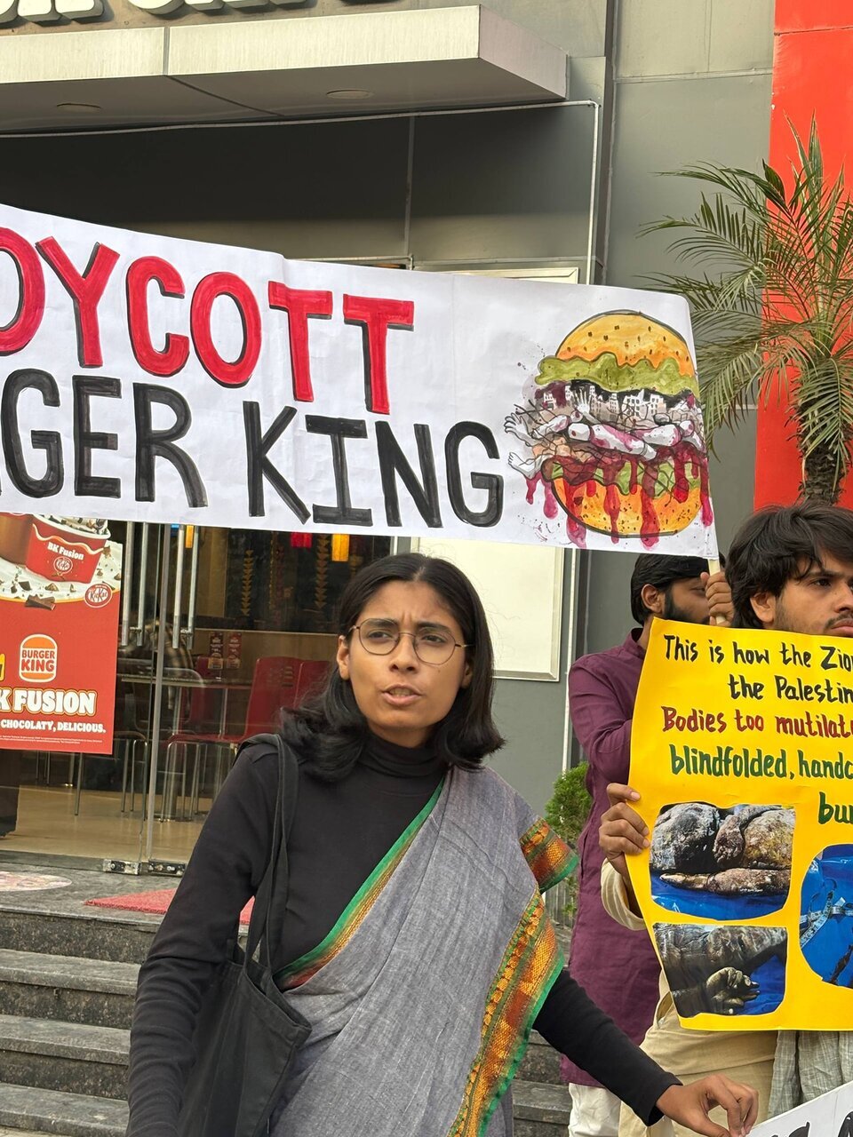 Rakyat India Bersolidariti dengan Palestin menganjurkan demonstrasi bantahan pada 24 Oktober di hadapan cawangan Burger King di Rohini, Delhi. Bantahan ini membantah genosid berterusan yang dilaksanakan oleh rejim Zionis Israel terhadap rakyat Palestin serta penglibatan Burger King di dalamnya.
